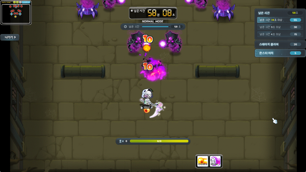 • Azmoth Annilihation Battle: Use the Magic Orb’s bullets to stop the Cursed Ones. This is a minigame stage where you use the arrow keys to move around the map while using WASD to shoot bullets at the enemies and Space to dash and dodge attacks. (Ball icon)