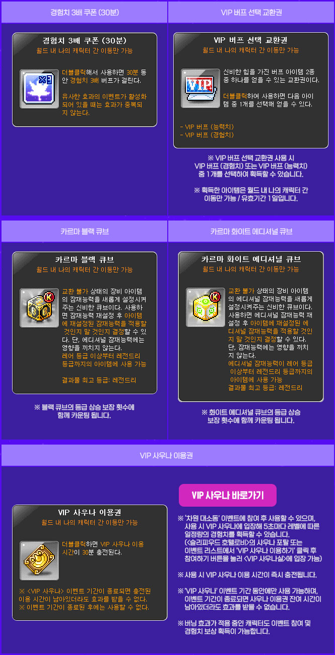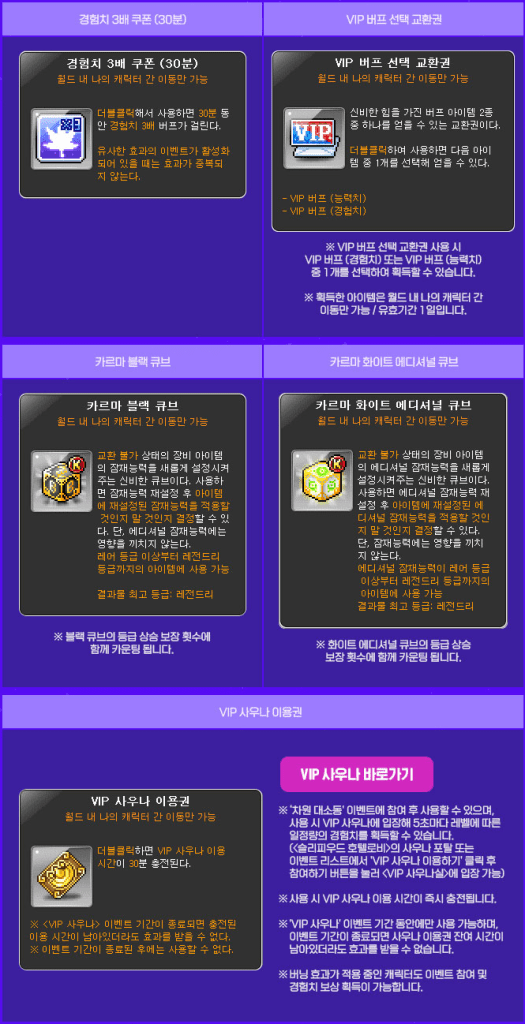※ The charged VIP Sauna usage time is shared between all characters within the Maple ID.