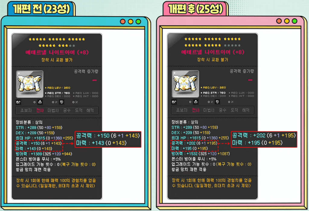 Existing 23 star and higher equipments’ Star Force number of stars and stats will be adjusted.