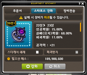 The meso cost when enhancing items at 17~19 stars and starting from 21 stars has been increased.
