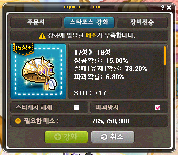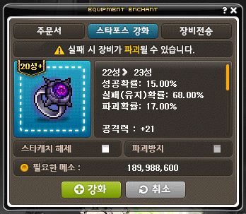 The meso cost when enhancing items at 17~19 stars and starting from 21 stars has been increased.
