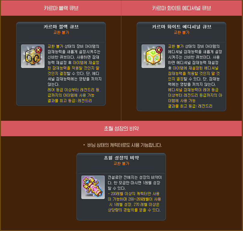 - The Strange Cube, Karma Meister Cube, Karma Strange Additional Cube, and Karma Star Force 17 Star Enhancement Scroll (Level 160) purchased from the Challengers Shop are Challengers World-only items and you cannot World Leap while holding them.