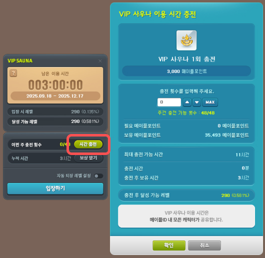 When you press the ‘Recharge Time’ button in the UI or use a VIP Sauna Entry Coupon, a UI will appear that lets you set the number of charges you want.