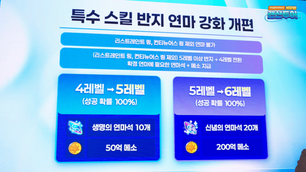 - They don’t want people swapping rings anymore, so even though the Ring Exchange skill has been removed, they have also added the condition that if you equip a Special Skill Ring, the skill’s maximum cooldown will be applied (so even if you double click to switch your ROR to a WJ, it won’t work because it will be on a 2 minute cooldown).