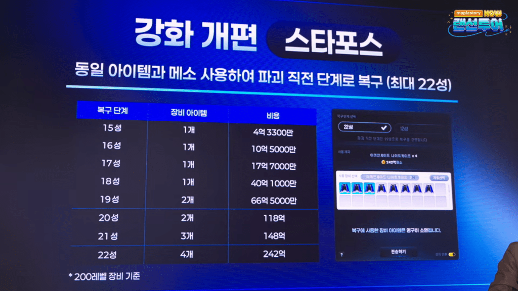- When you destroy an item when Star Force enhancing it, you can now use additional spares and mesos to restore the trace to the star that it boomed at (up to 22 stars).