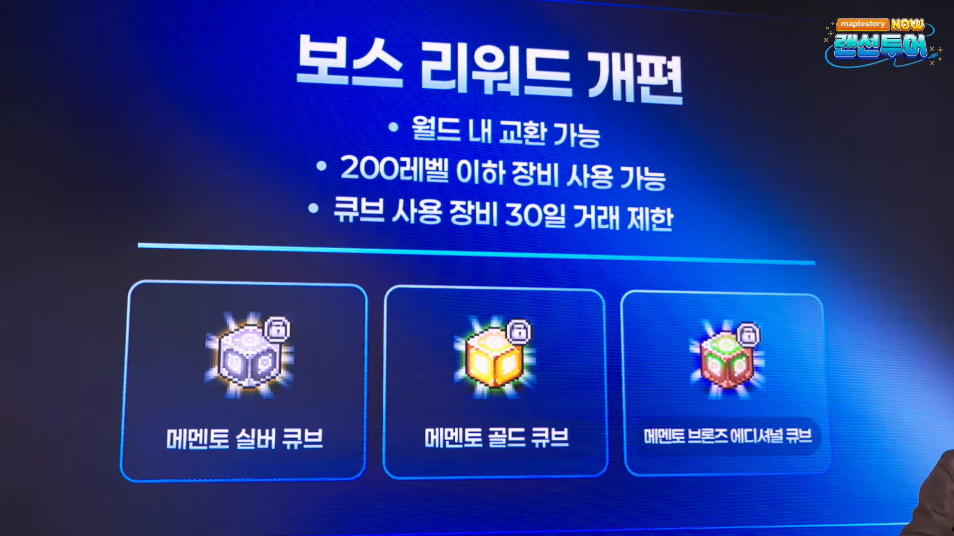 - Boss rewards will also be reorganized (in terms of cubes). They will now drop the following cubes that can only be put into storage, can only be used on level 200 or lower equipment, and will restrict the equipment that they are used on from being traded for 30 days (‘Memento’ feature).
