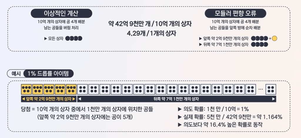 - This was caused by an issue called modulo bias. It can’t be explained just by disclosing internal source code or data structures because if you just look at the code, it doesn’t look like there’s an error, which is why they never caught it. Changseop spent some time explaining it in detail, but maybe you can just google ‘modulo ‘bias’ 🙂