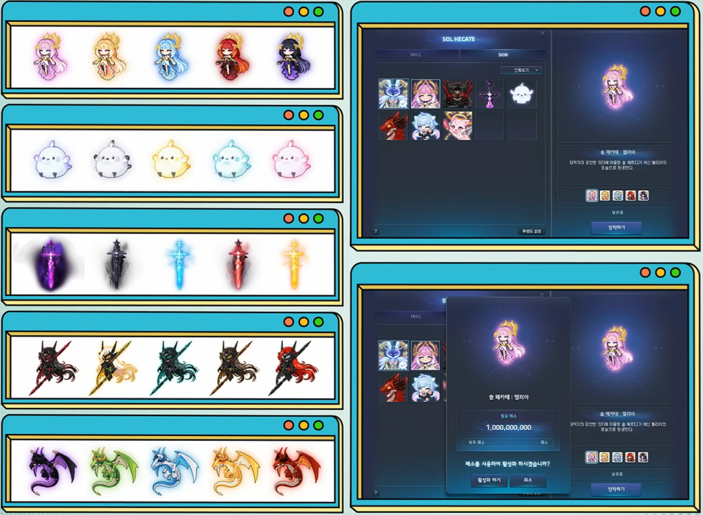 - You can unlock 5 different skins by paying 1b mesos each. When you unlock a skin, you will be able to use any of the 5 colour variations.