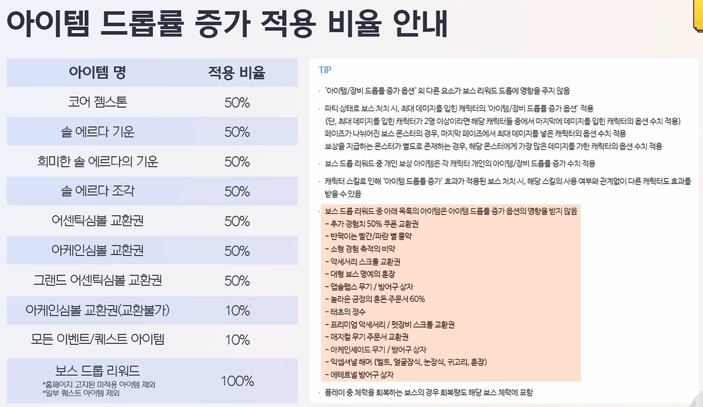 - On the MapleStory homepage, there is a guide for the ‘item drop rate increase’ stat. It says that some items only apply a certain ratio of item drop rate but it doesn’t state specifically which items or how much it applies. Now that they have looked into this issue, resolved it, and added the base 24% item drop, they would like to inform players about this more specifically.