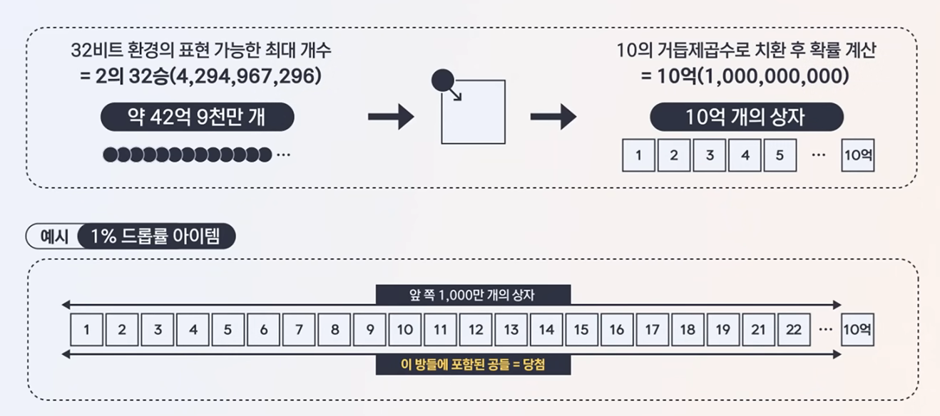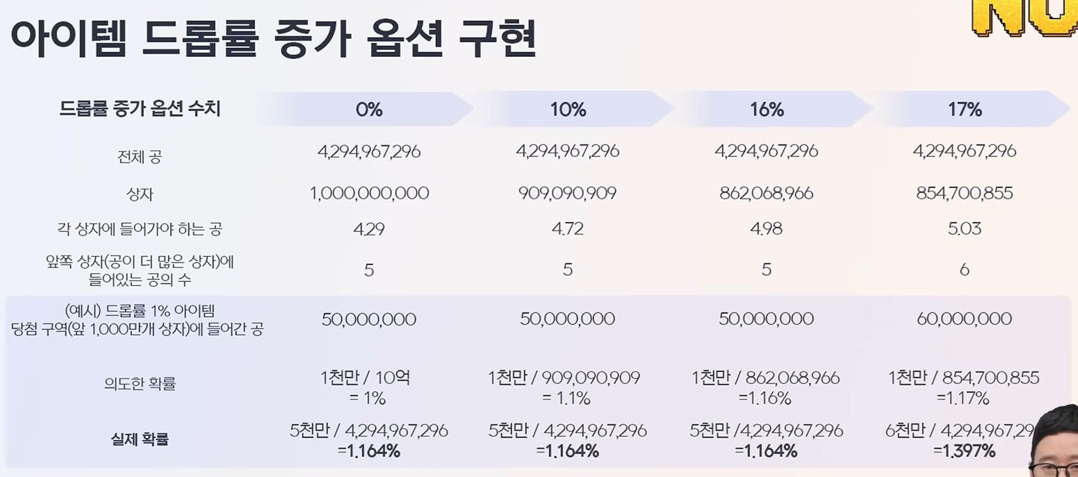- If an item is supposed to have a 1% drop rate, you would think that picking one of the balls that are in 10m of the 10b boxes (10m/10b = 1%). However, in reality, the first 290m boxes have 5 balls instead of 4, increasing that rate, since we started with 4.29b balls. So the real drop rate becomes 50m/4.29b = ~1.164%, which is ~16.4% higher than intended.