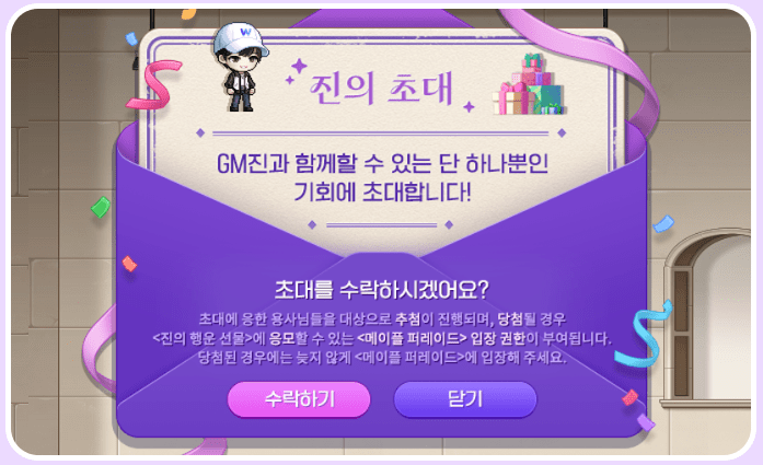 At 7:40 PM, Jin will send out invitations to 1500 players online at that time. If you receive it, you can accept and move to the <Maple Parade> map.