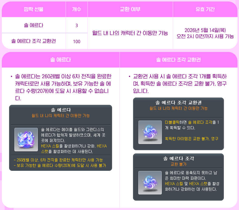 If you login on April 22, you will receive Jin’s Surprise Gift which contains 3 Sol Erda and 100 Sol Erda Fragments. You can only claim this 1 time per Maple ID.